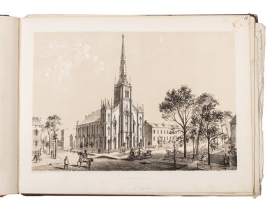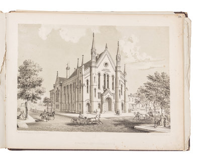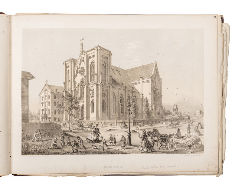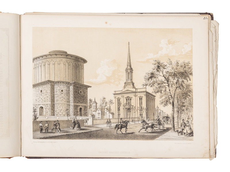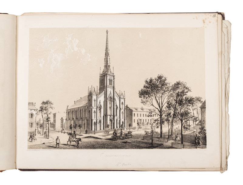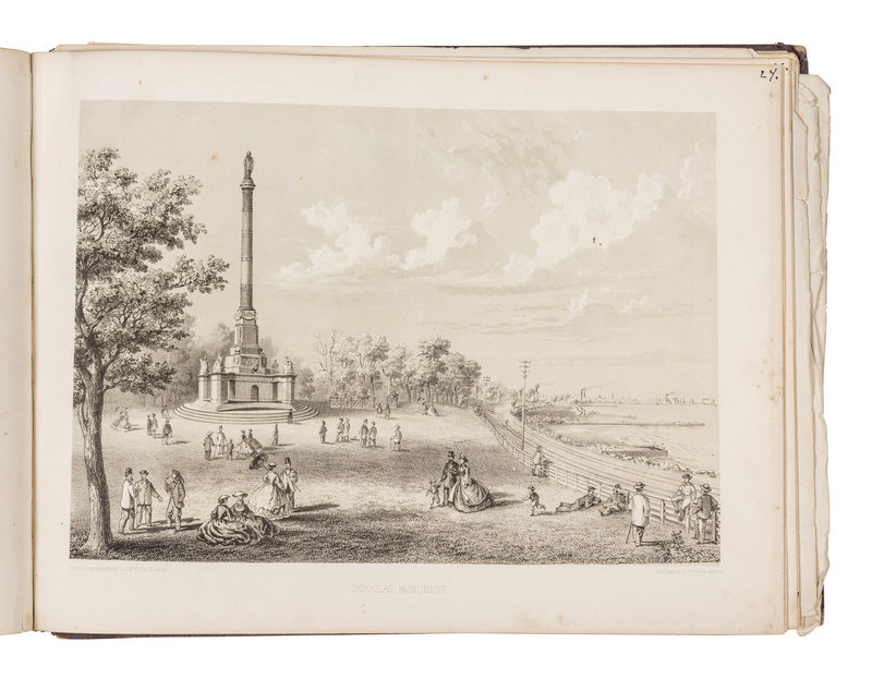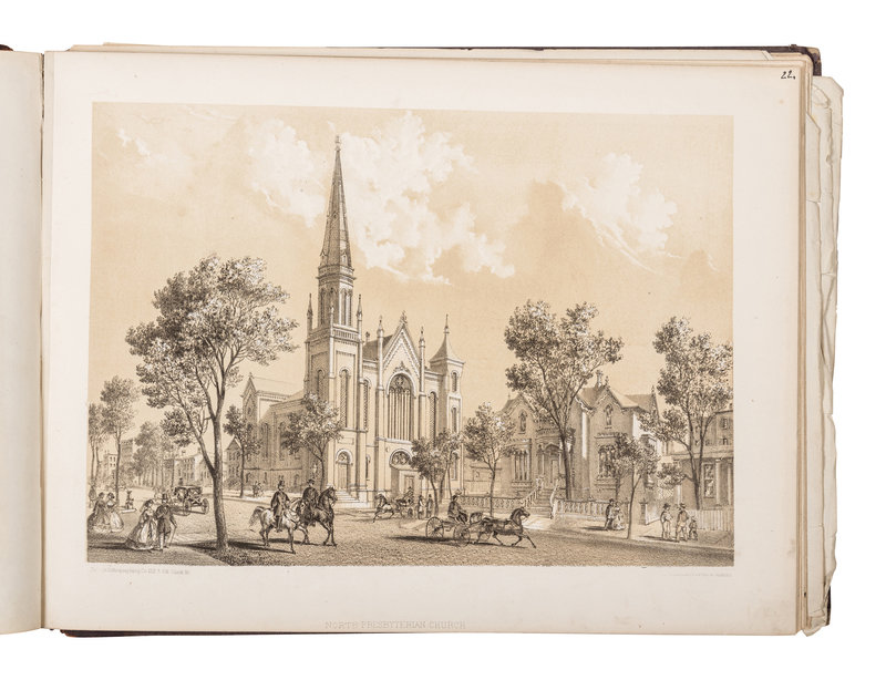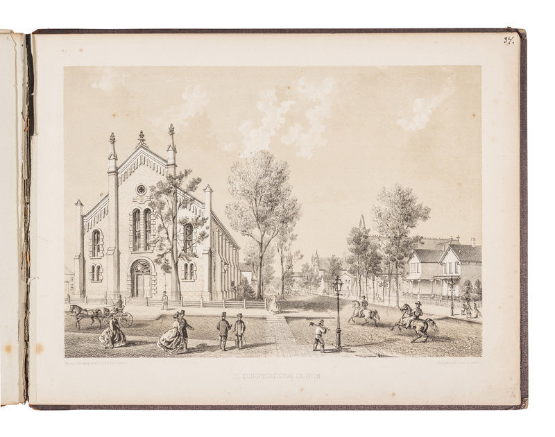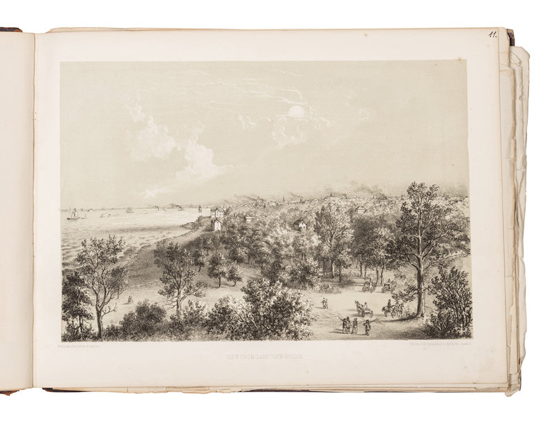 8 tinted lithographs as printed by the Chicago Lithographing Company and depicting the Jesuite Church, View from Lake View House, Universalist Church, North Presbyterian Church, Douglas' Monument, Second Baptist Church, Plymouth Congregational Church, and Congregational Church; many with accompanying literary descriptions by James W. Sheahan (1824-1883) in German.