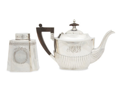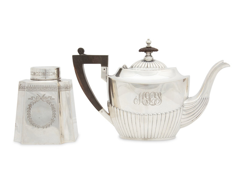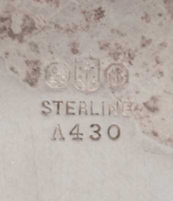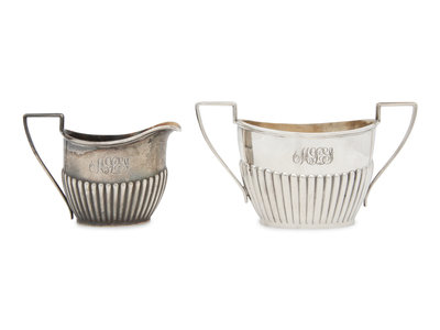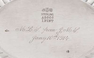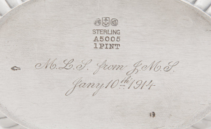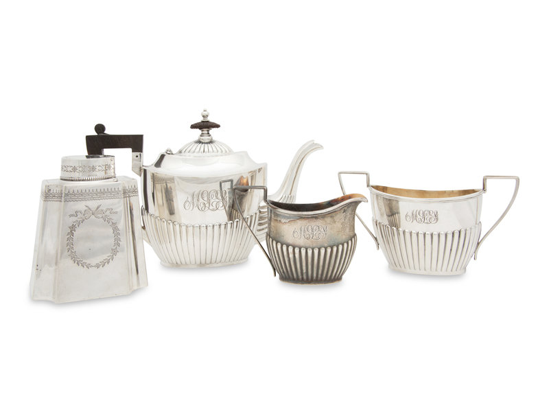 includes a creamer marked A5005 / 1/4 pint, a sugar marked A5005, a small pitcher marked A5005 pint and a tea caddy marked A430. All bear Gorham and Sterling marks.