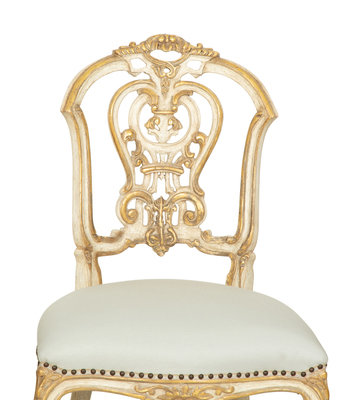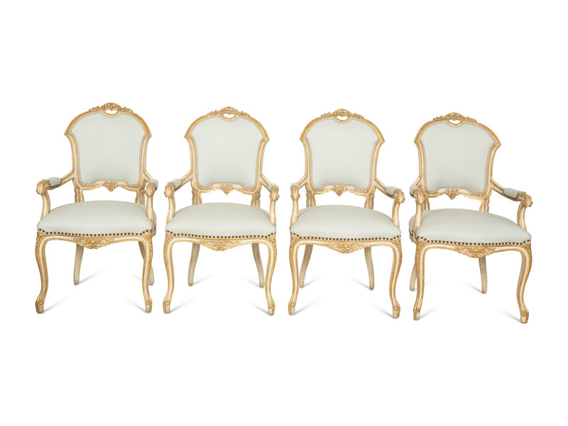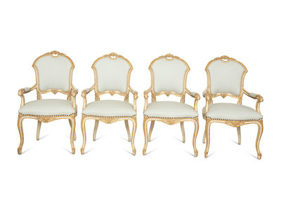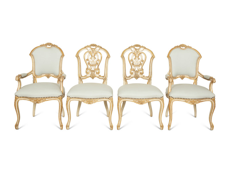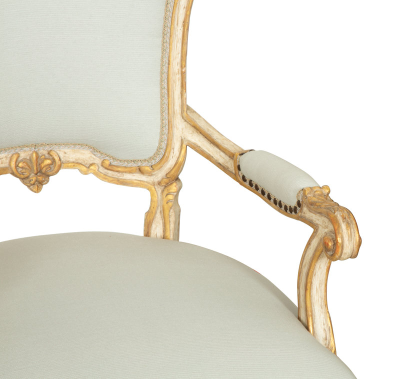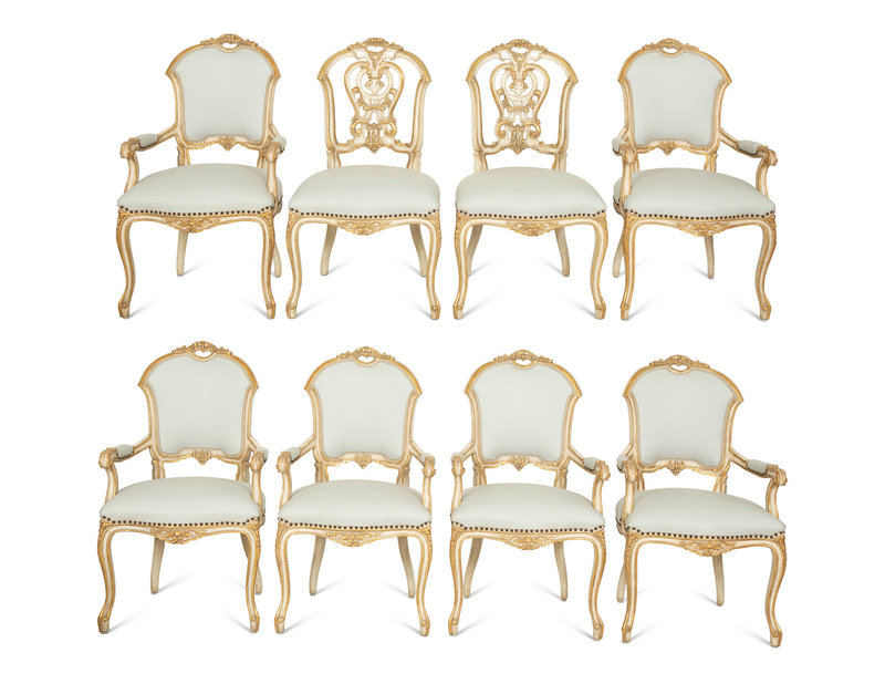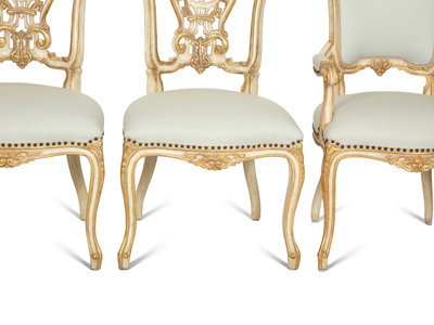 Six Ebanista Dauphine II Gilt Decorated Armchairs together with a Pair of Dauphine I Side Chairs