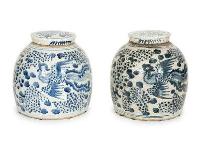 A Pair of Chinese Blue and White Porcelain Covered Jars