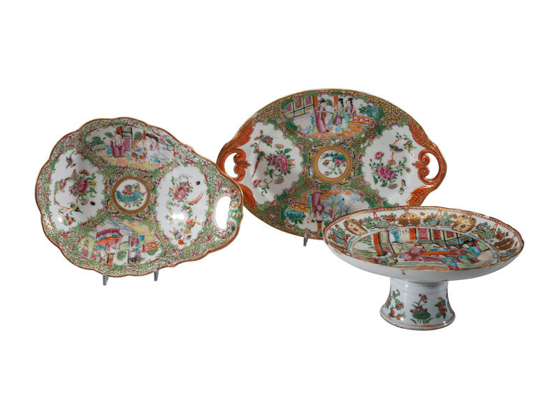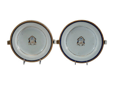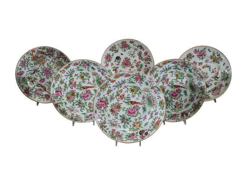 comprising a pair of parcel gilt armorial plate warmers, a Rose Medallion tray, bowl, and tazza, and six 'bird and butterfly' plates.