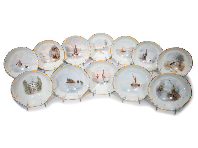 together with 12 Haviland Limoges bowls with sailboat and landscape decoration.