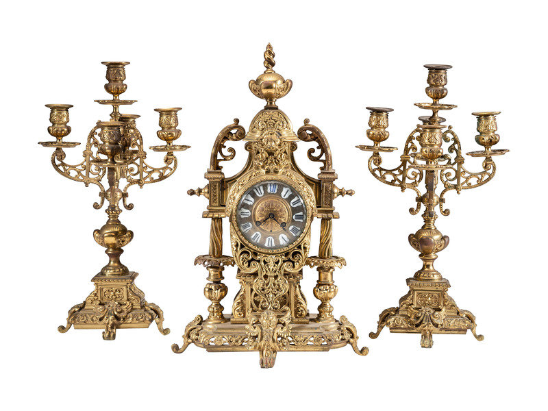 comprising a mantle clock and a pair of five-light candelabra.