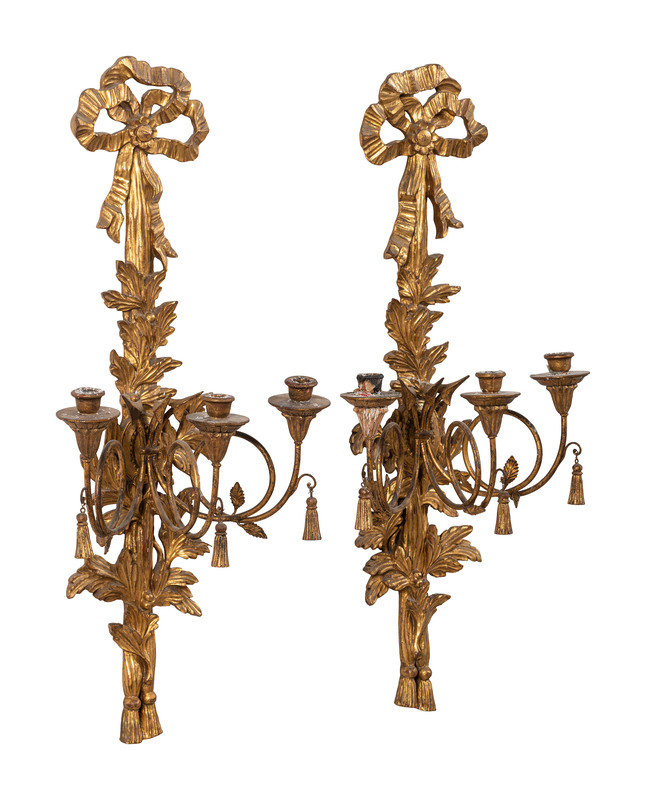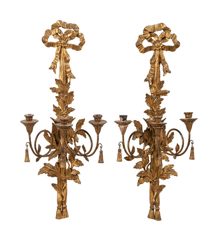 A Pair of Italian Carved Giltwood Three-Light Wall Sconces