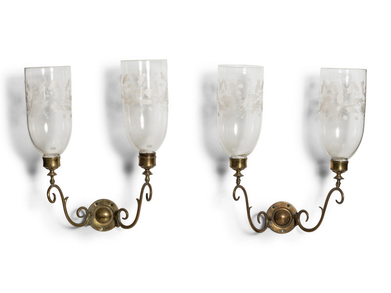 A Pair of Classical Brass and Etched Hurricane Glass Two-Light Wall Sconces