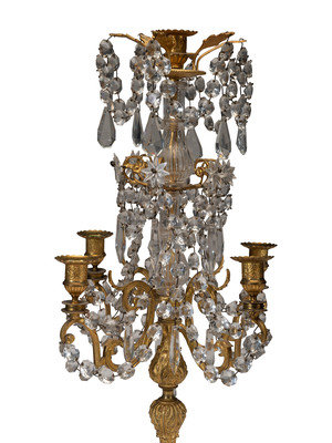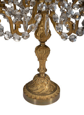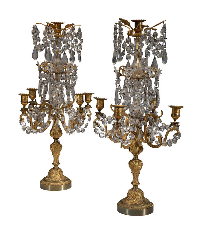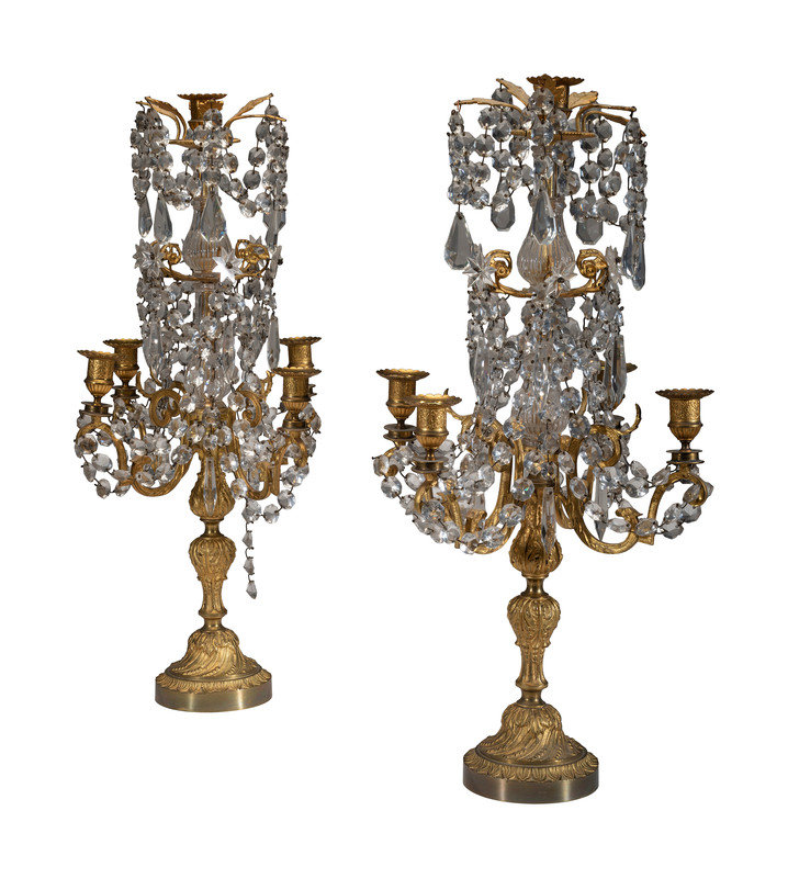 A Pair of Gilt-Bronze and Crystal Five-Light Candelabra