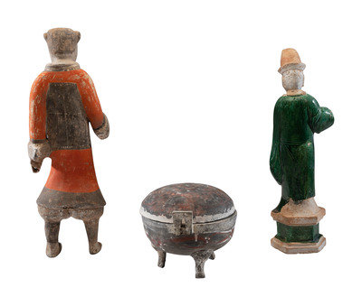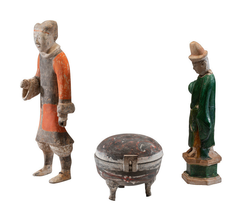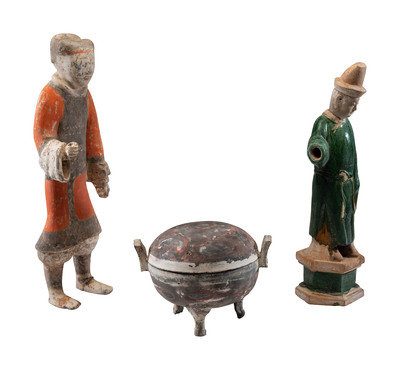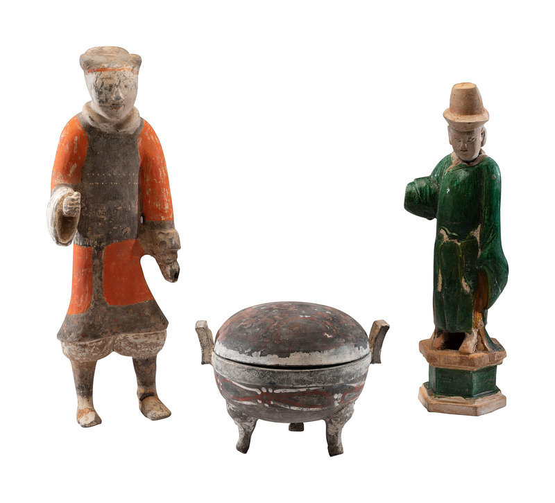 comprising a Han dynasty pottery figure of a warrior, a Han dynasty pottery covered ding vessel and a Ming dynasty painted stoneware figure of a male attendant.