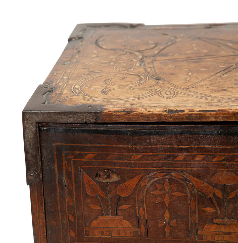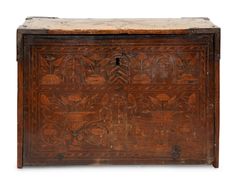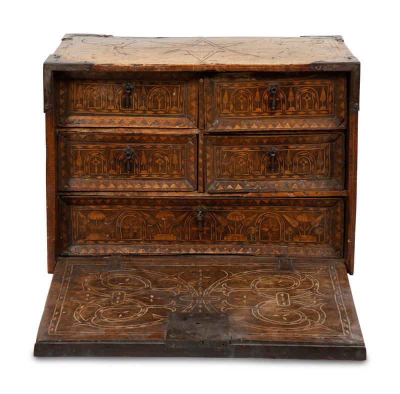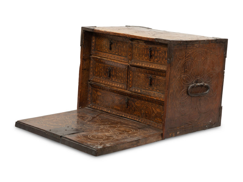 A Spanish Iron Mounted Walnut Marquetry Vargueno/Traveling Desk