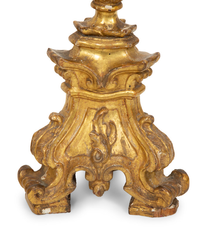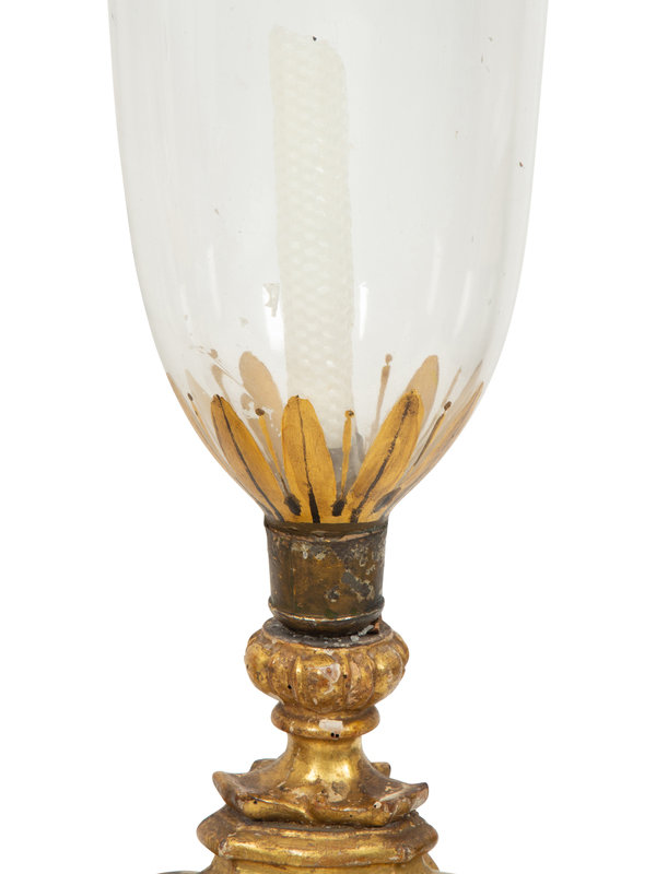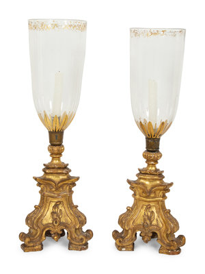 A Pair of Italian Giltwood Altar Candlesticks with Hurricane Shades