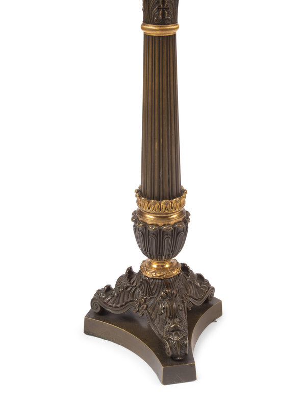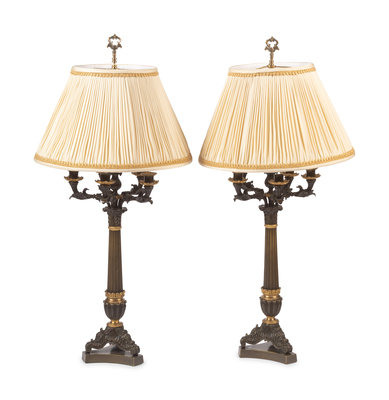A Pair of Empire Style Gilt and Patinated Bronze Six-Light Candelabra Mounted as Lamps