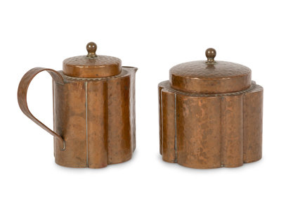 A Joseph Heinrichs Hammered Copper on Silver Creamer and Sugar
