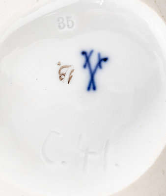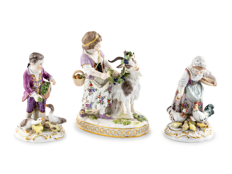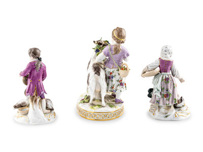 comprising a group depicting a girl with a goat, bearing crossed swords in underglaze blue, incised H81 and impressed 21, and a pair depicting a girl and boy feeding geese and chickens, both marked with crossed swords in underglaze blue, the girl further incised 2814 and impressed 153, the boy incised C41 and impressed 35.
