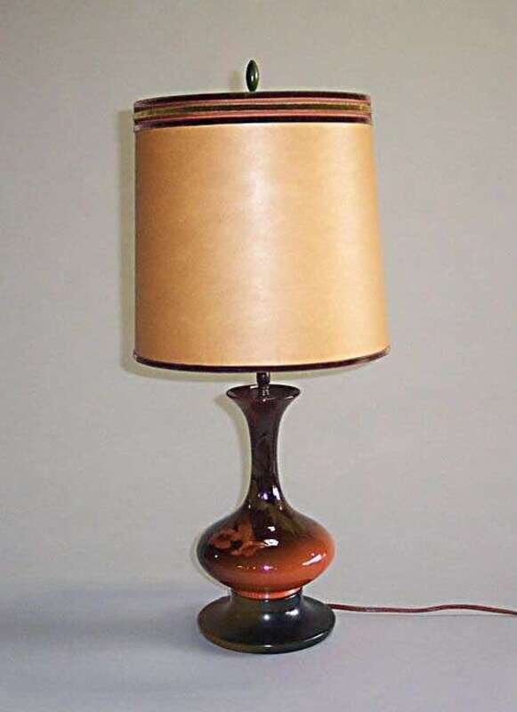 Painted & glazed ceramic; partial flame mark visible, base drilled for lamp, h: 9 in.