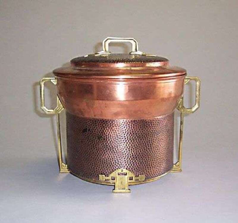 Hammered copper, cast brass, tin; unmarked, with tin liner, h: 12 1/2 in.