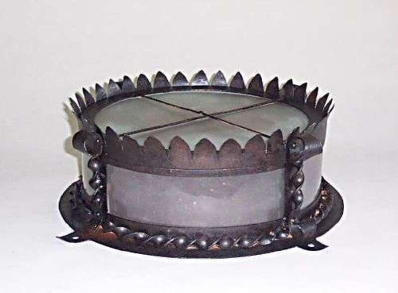 Wrought iron, glass; stamped "SAMUEL YELLIN," cleaned patina, electrified, dia: 21, h: 7 in.