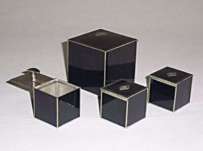 Enameled metal, glass; four pieces including box and three ashtrays, monogrammed diamond to each, box: 3 in. square.