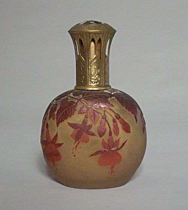 Etched & polished glass, brass; signed in cameo, lid stamped "Lampe Berger MADE IN FRANCE," h: 6 1/2 in.