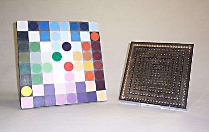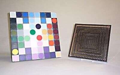 Glass, plastic, chrome, 12 x 12 in; acrylic on canvas signed Ruth Streilein (Moore graduate), 16 x 16 in.