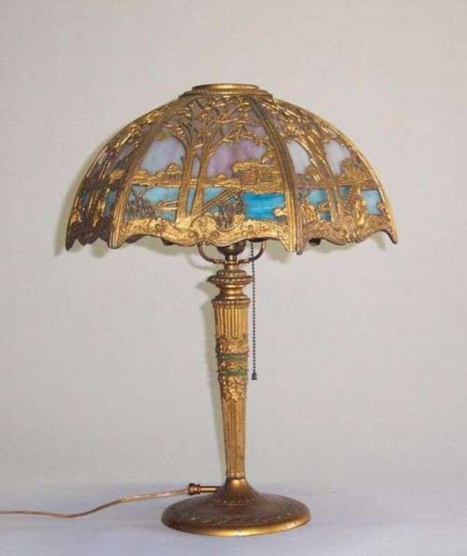 Gilt metal, glass; base cast with "ML CO 233," h: 21 1/2, dia of shade: 16 in., two glass panels repaired.