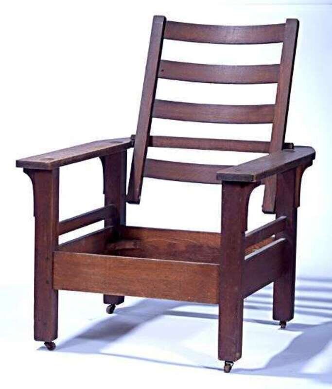 Oak; red Handcraft decal, lacks seat, adjustable back, w: 32, depth of arms: 36 in.