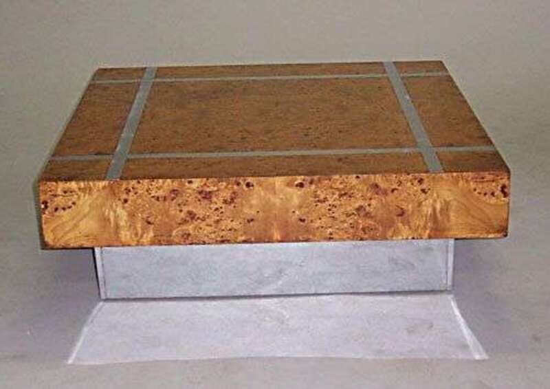 Bird's-eye maple; chromium, fiberboard; h: 12 1/3, top: 37 3/4 in. square.