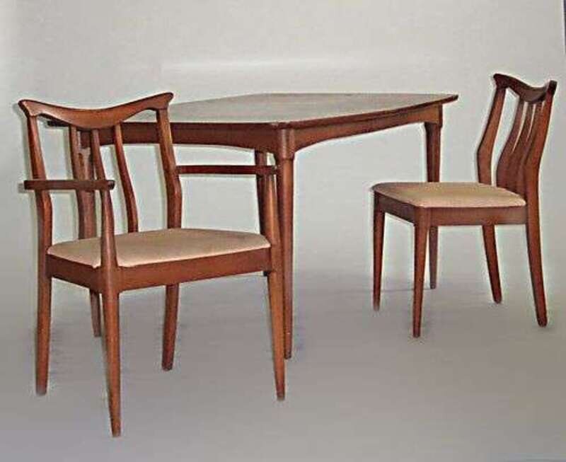 Teak; six chairs (two arm) and extension dining table with three 12-in. leaves, top: 59 x 39 in.