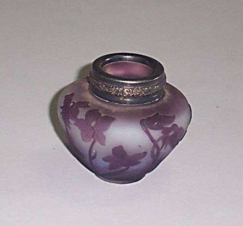 Etched glass, silver; cameo signature, marks to silver, chip to interior of bowl, h: 2 1/2 in.