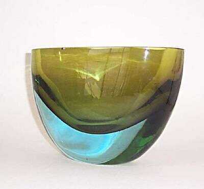 Blown glass; chip to edge, h: 6 1/2, l: 10 in.