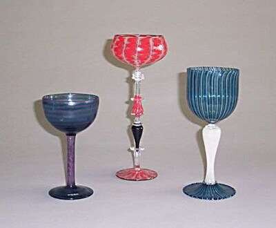 Blown glass; one a Kosta Boda goblet with engraved signature & sticker, h: 7 in.; the other two in the Italian style and signed illegibly, h: 9, 11 1/4 in.