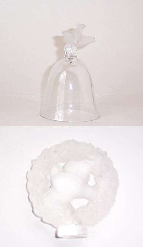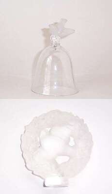 Molded & blown crystal; one a bell missing clapper, the other a cachet, both engraved "Lalique France.".