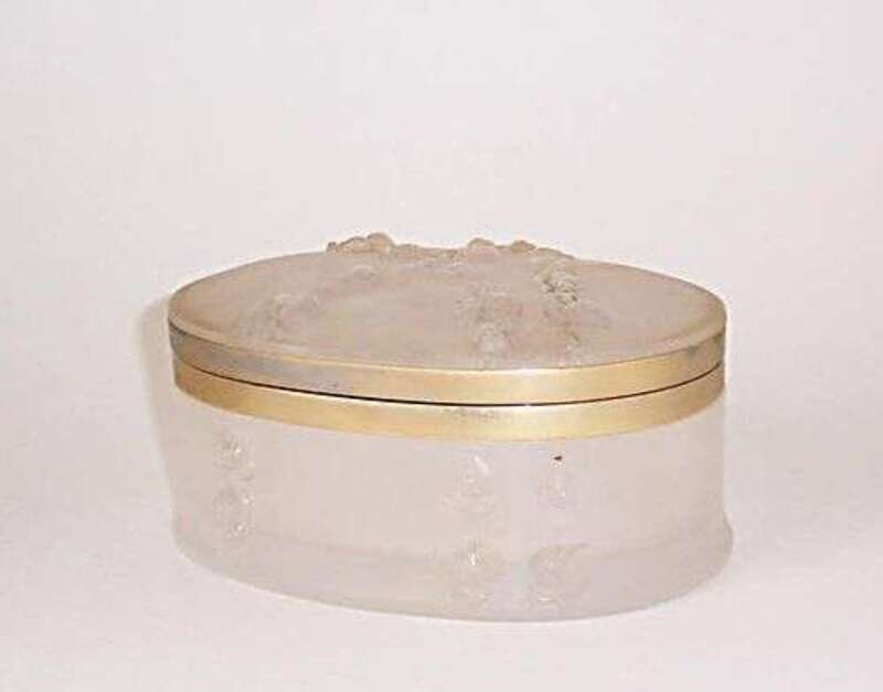 Molded glass, metal; engraved "Lalique France," retailer's label from Strasbourg, h: 3 1/2, l: 7 in.