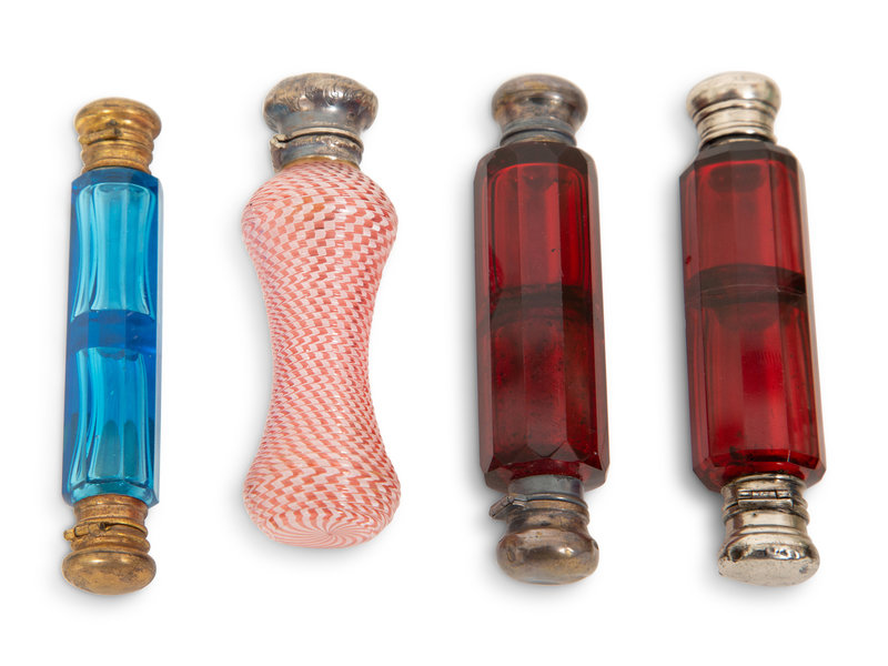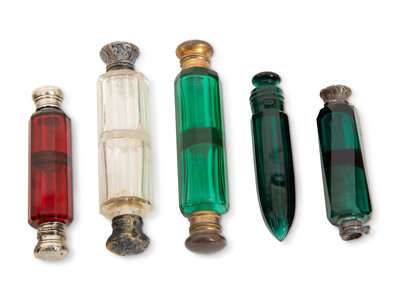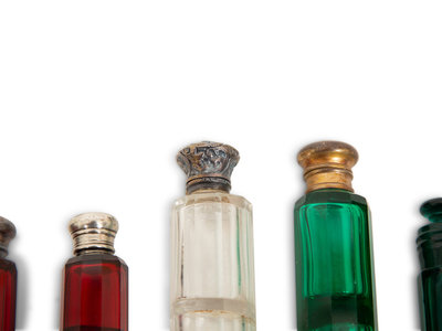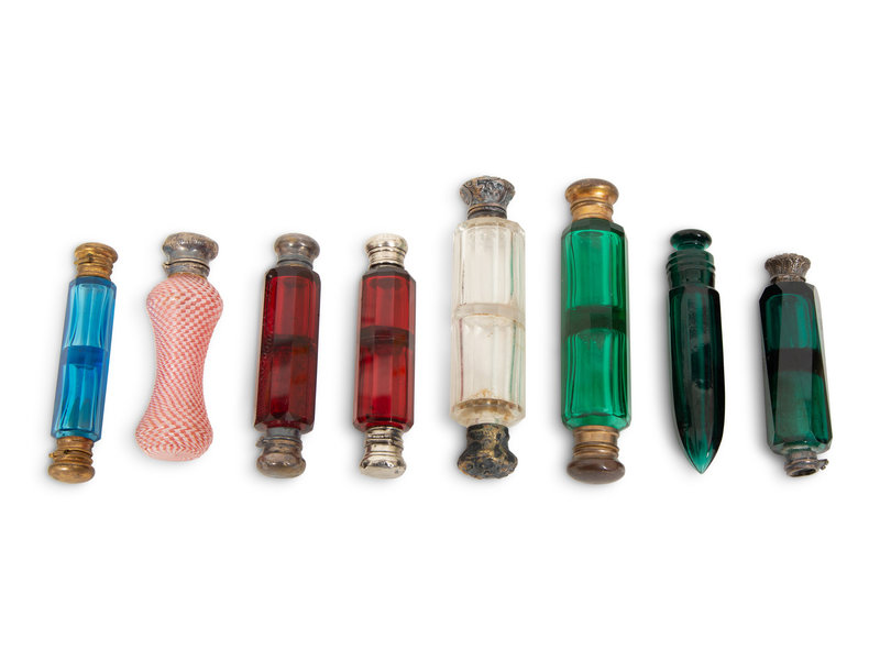 Eight English Silver or Brass-Mounted Glass Scent Bottles