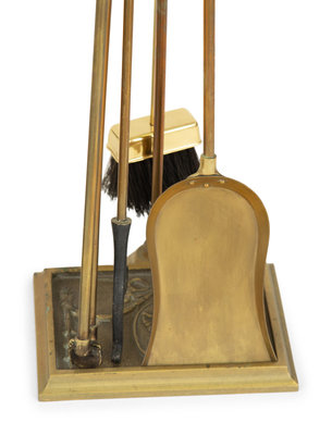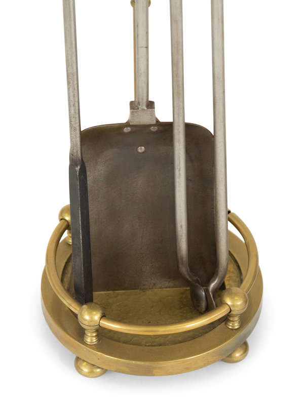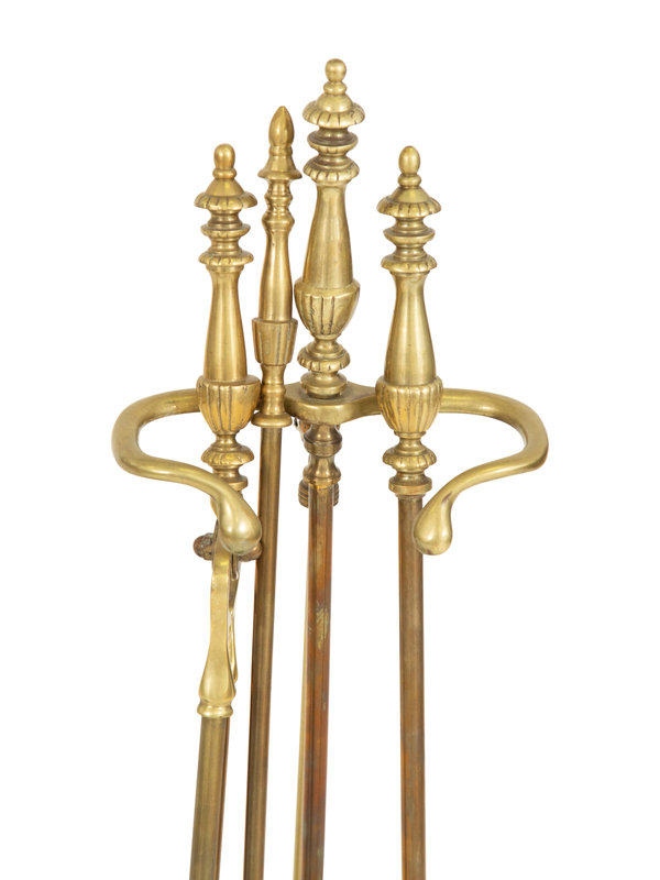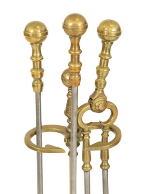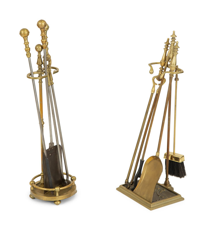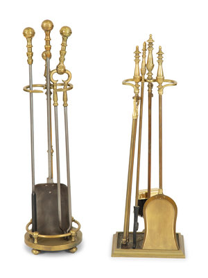 Two Sets of Brass Fire Tools and a Pair of Brass Andirons