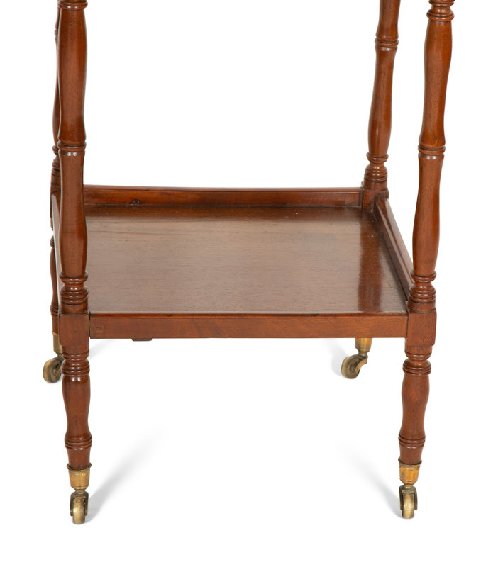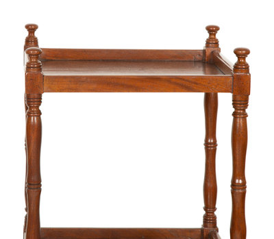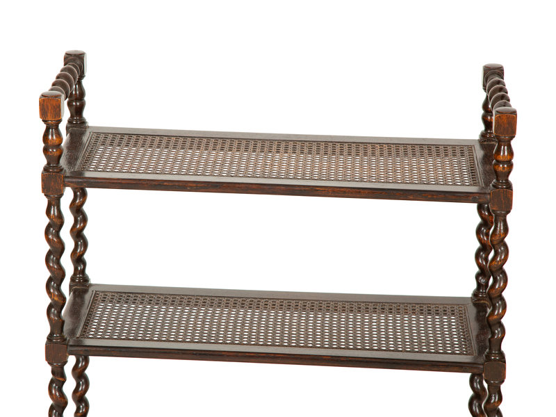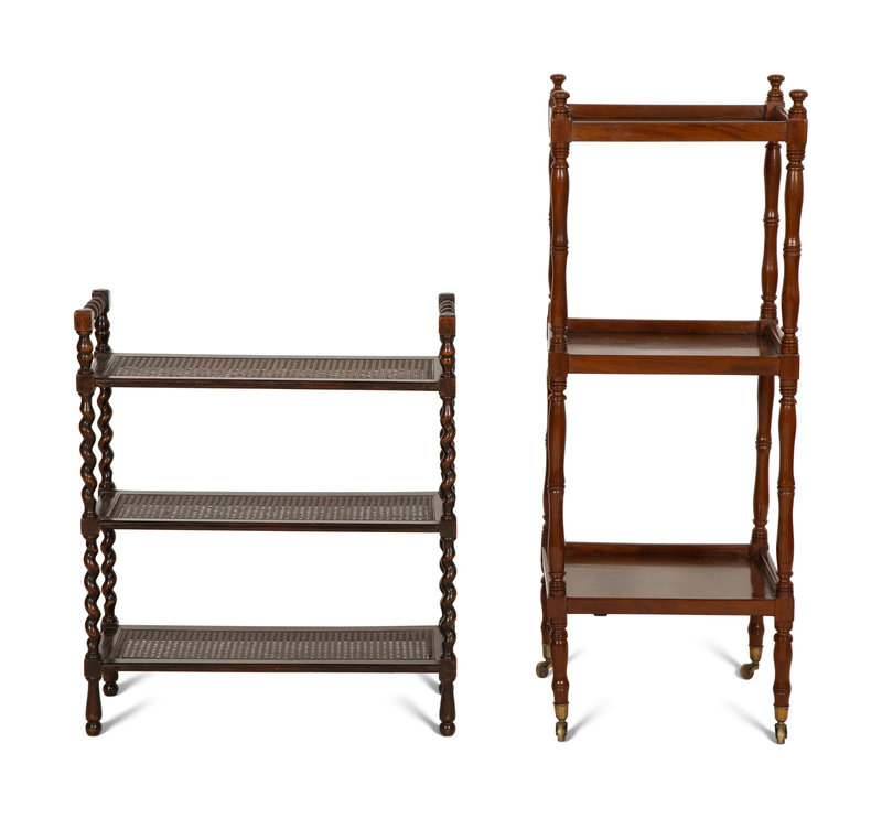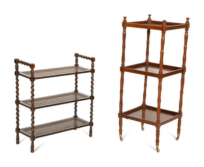 comprising an oak and cane etagere with barley twist supports and a mahogany three-tier etagere.