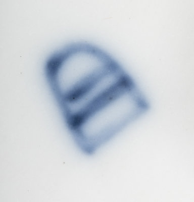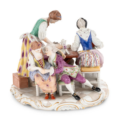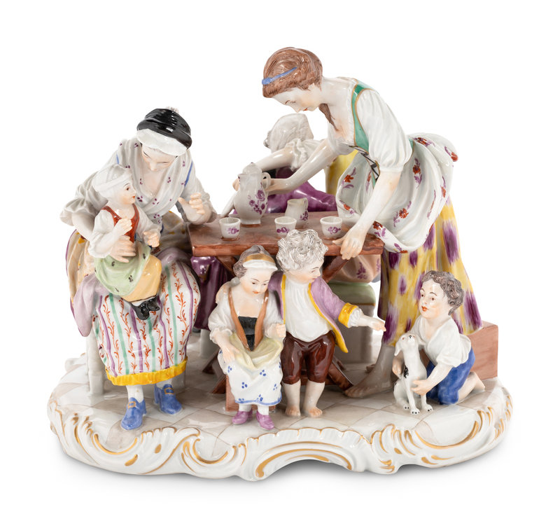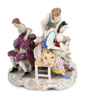 depicting a family around the table, bearing a beehive mark in underglaze blue to the underside.