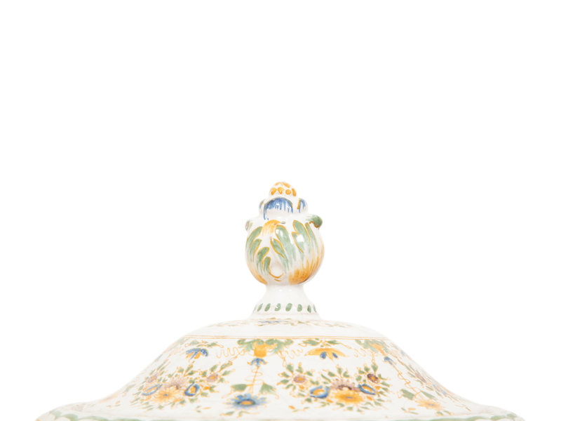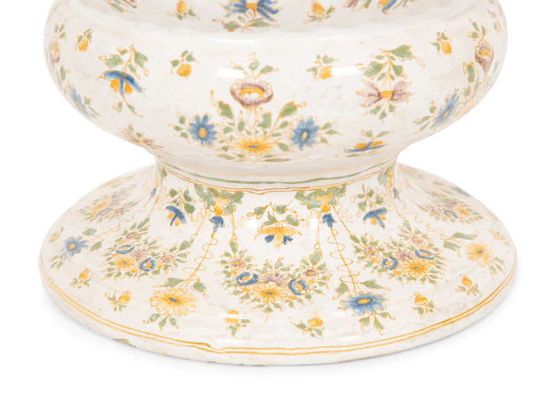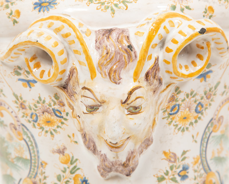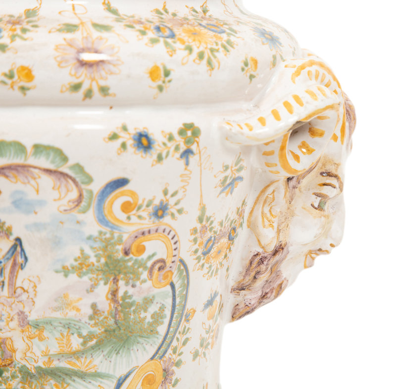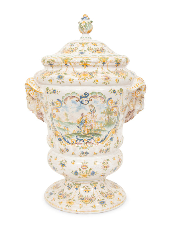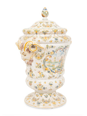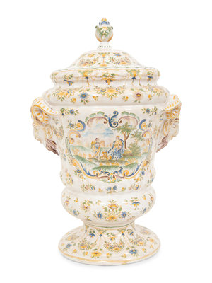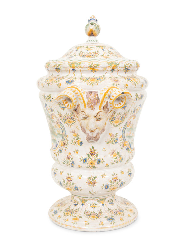 A Large Majolica Covered Urn with Horned Satyr Mask Handles