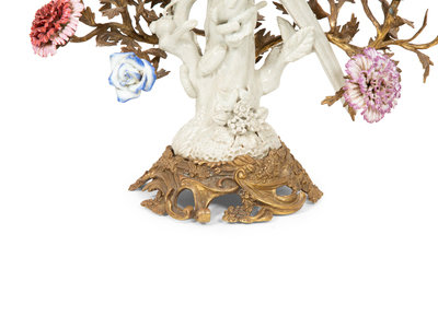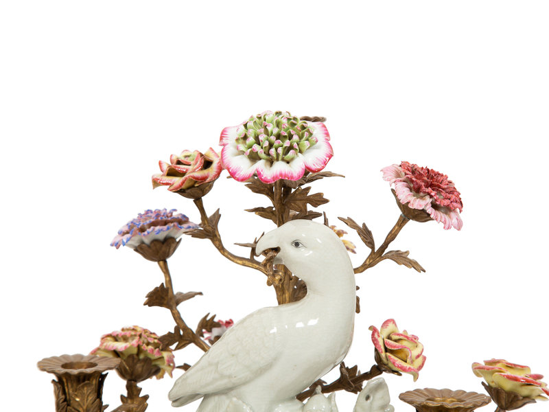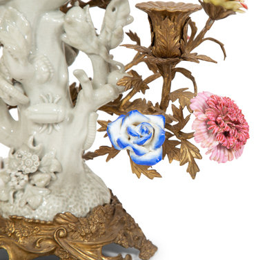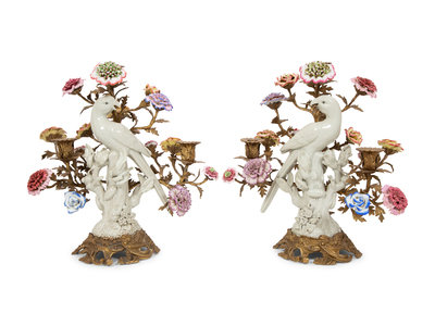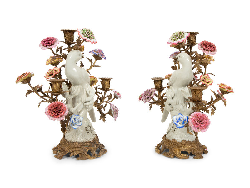 A Pair of Gilt Bronze and Porcelain Three-Light Candelabra