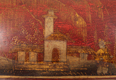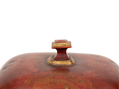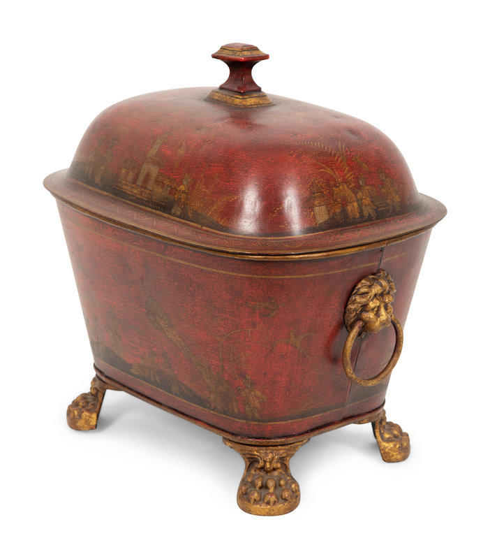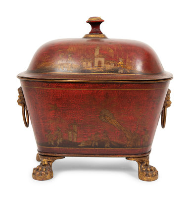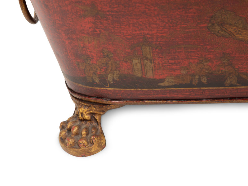 A Regency Style Red Tole Covered Box with Black and Gilt Chinoiserie Decoration and a Similar Bucket