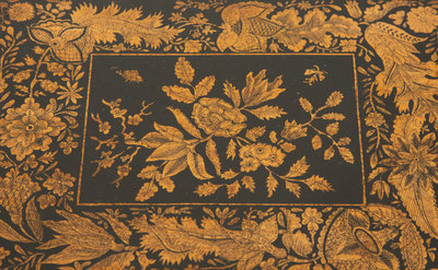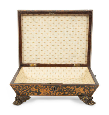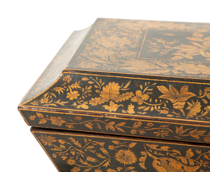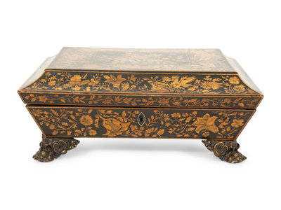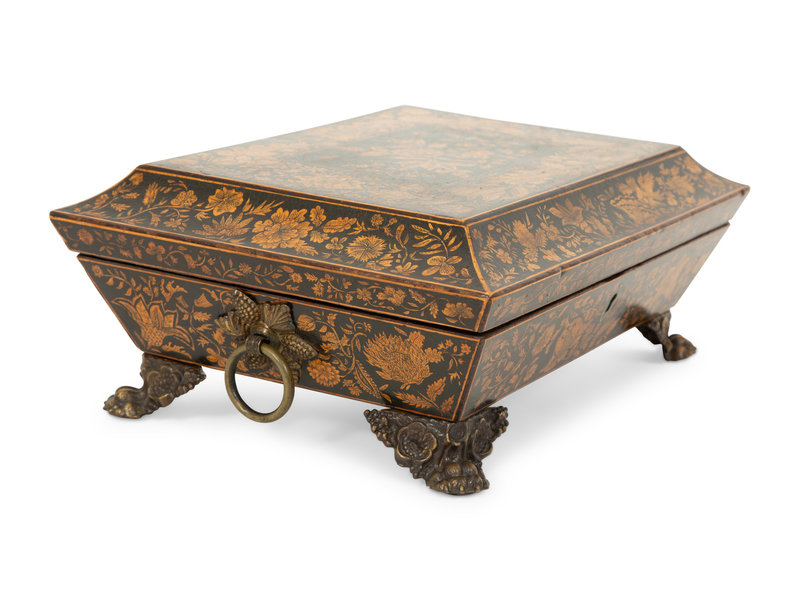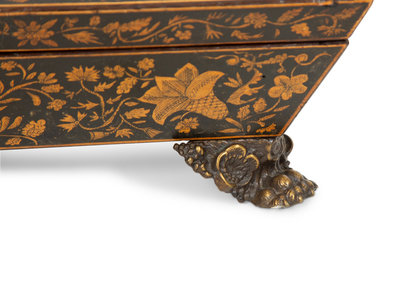 A Regency Black and Gilt Lacquer Box on Brass Paw Feet