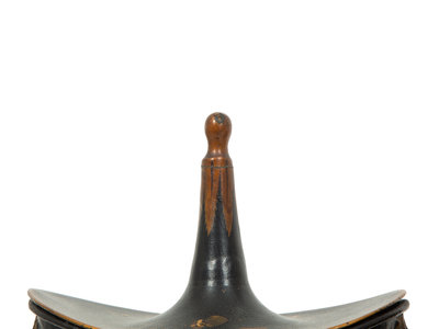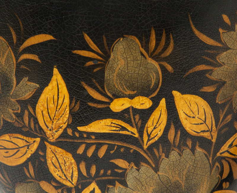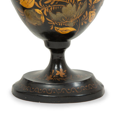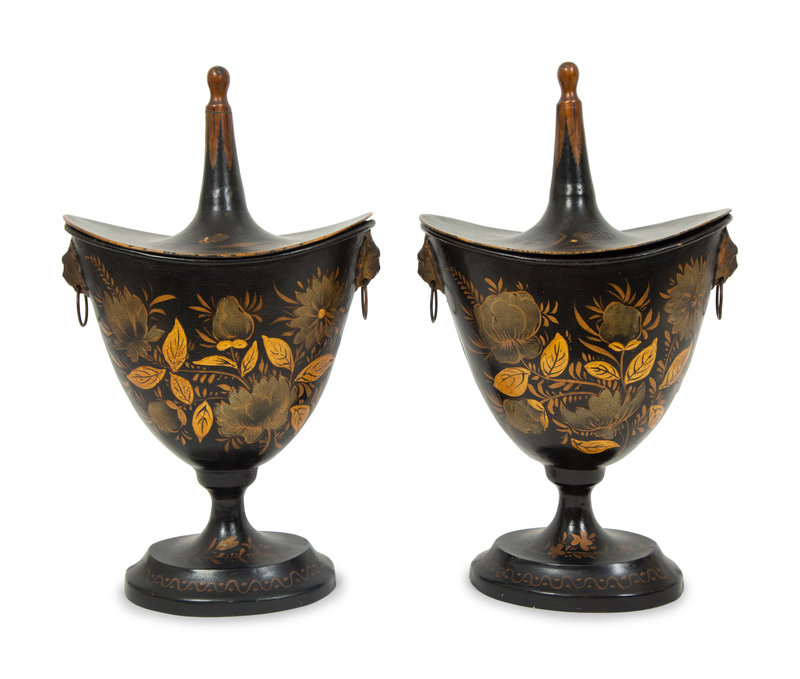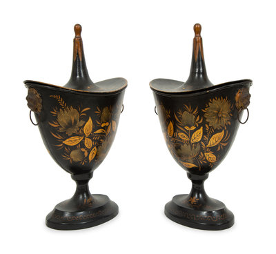 A Pair of Regency Style Black and Gilt Decorated Tole Covered Urns