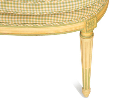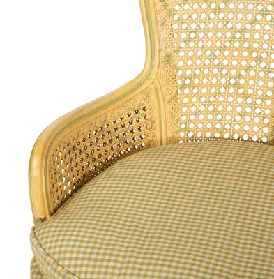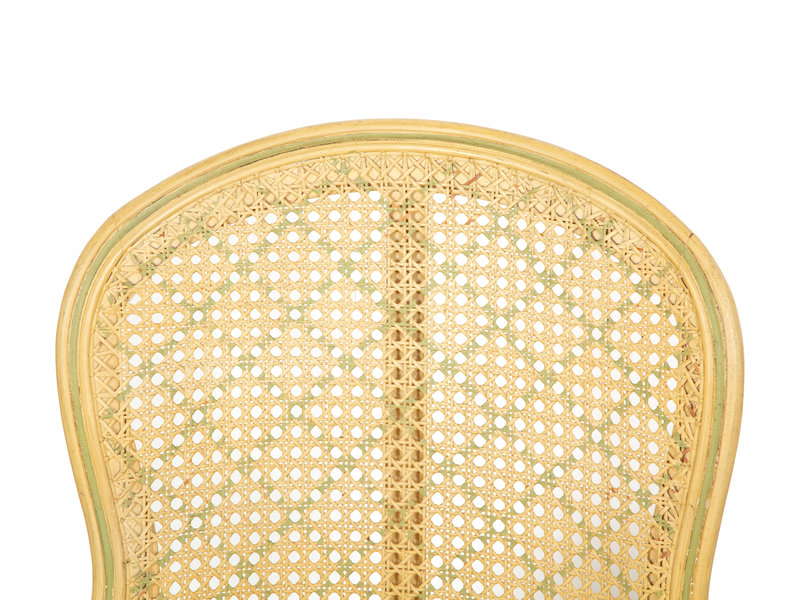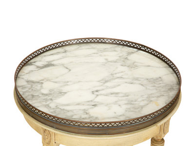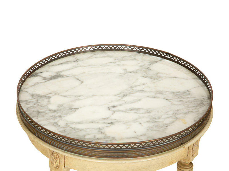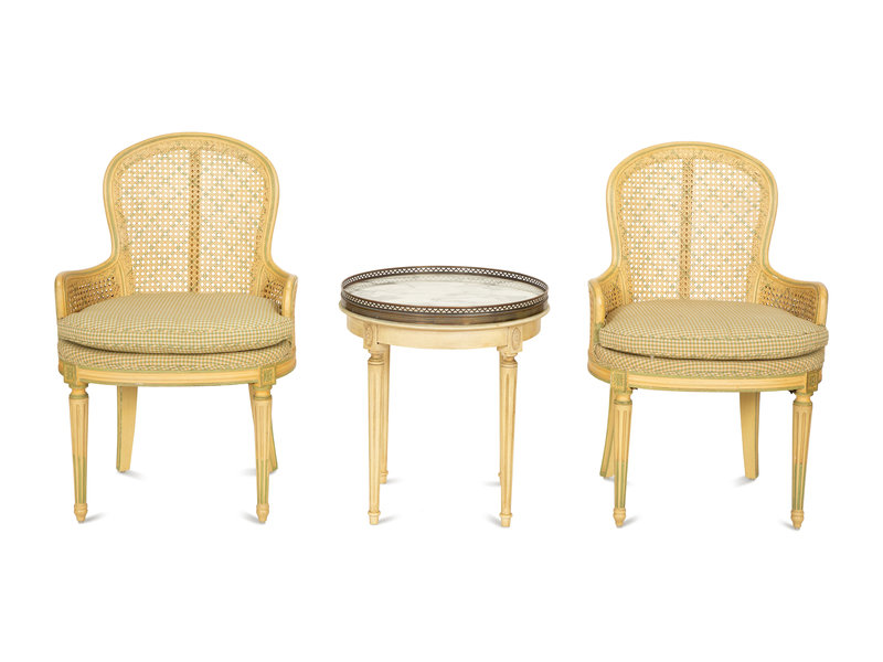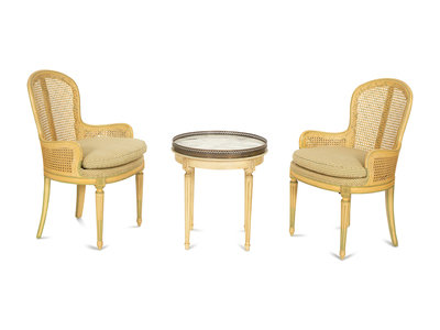 A Pair of Louis XVI Style Painted Caned Back Side Chairs with a Marble Top Gueridon