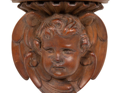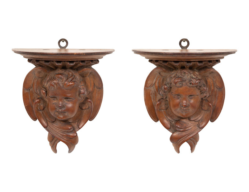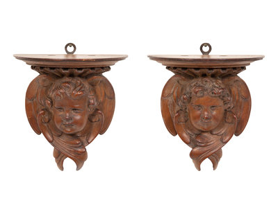 A Pair of English Carved Pear Wood Cherub Wall Brackets