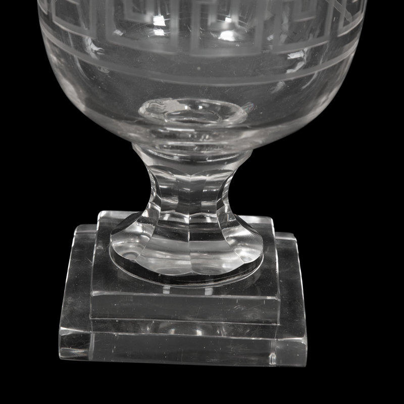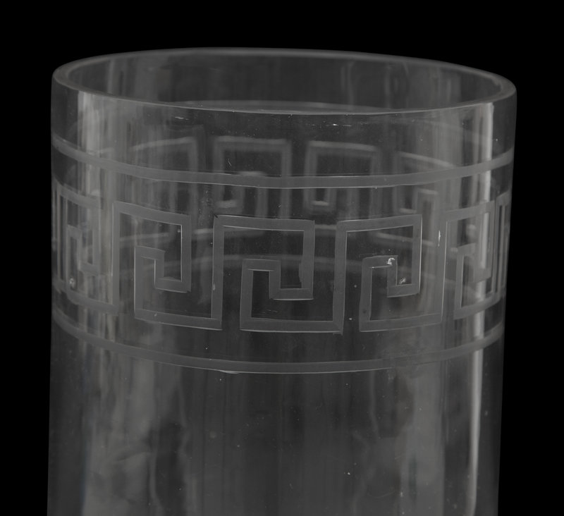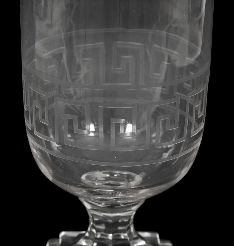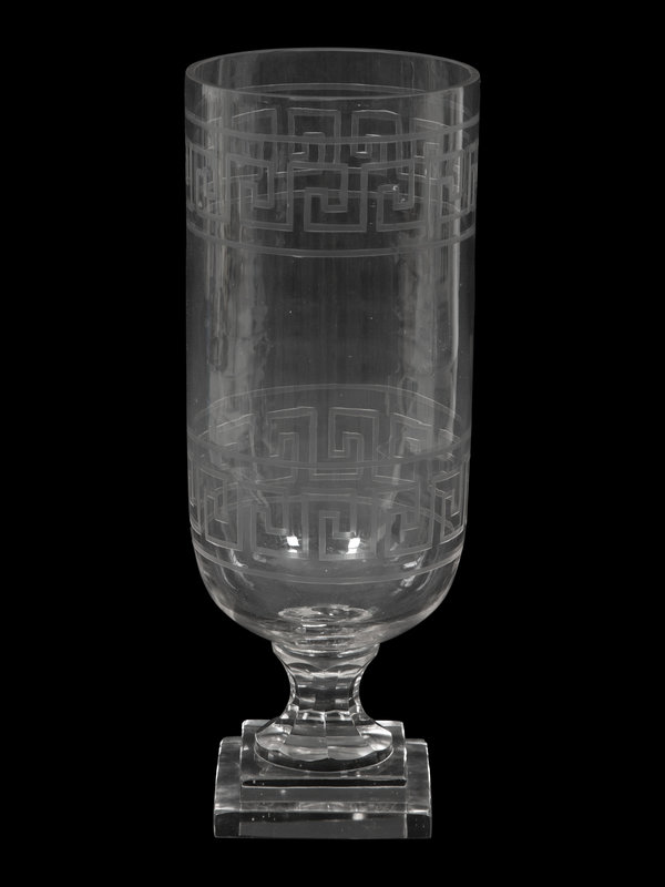 A Triple Etched Banded Greek Key Hurricane Lamp