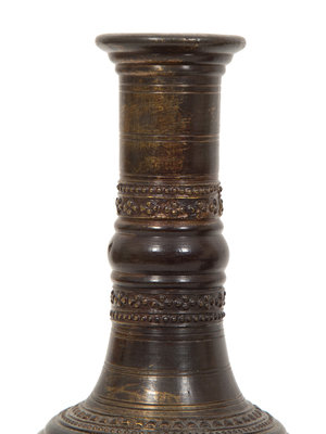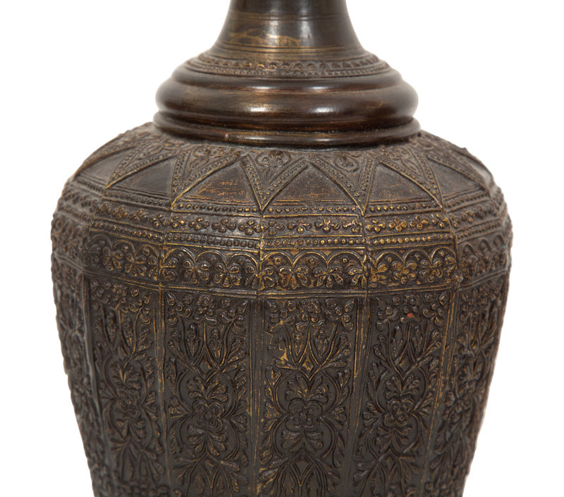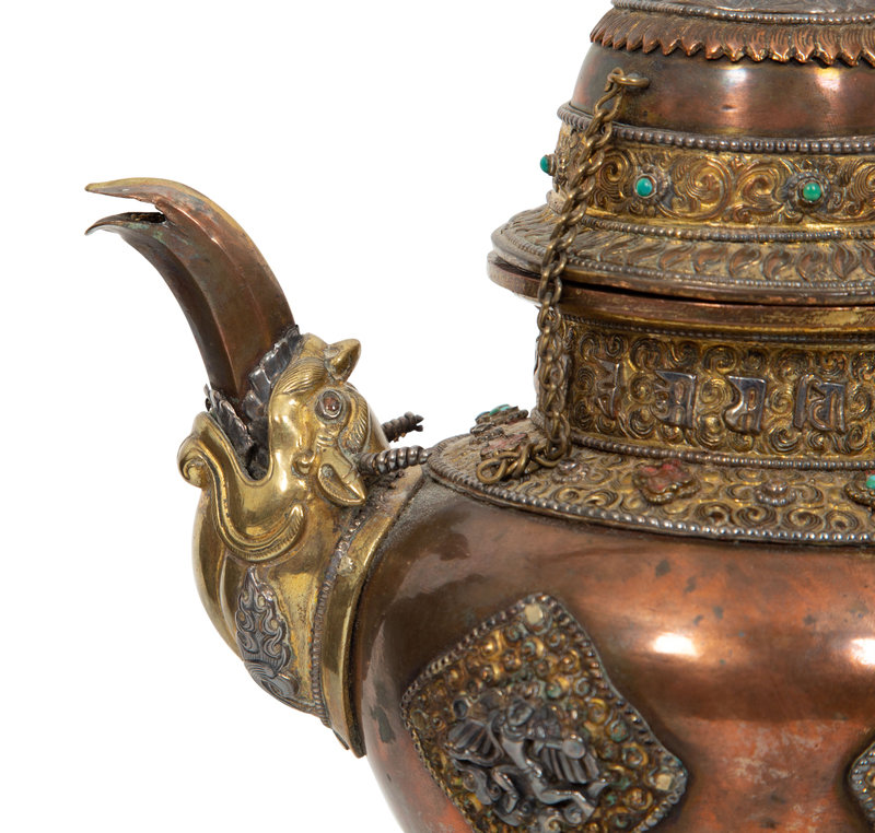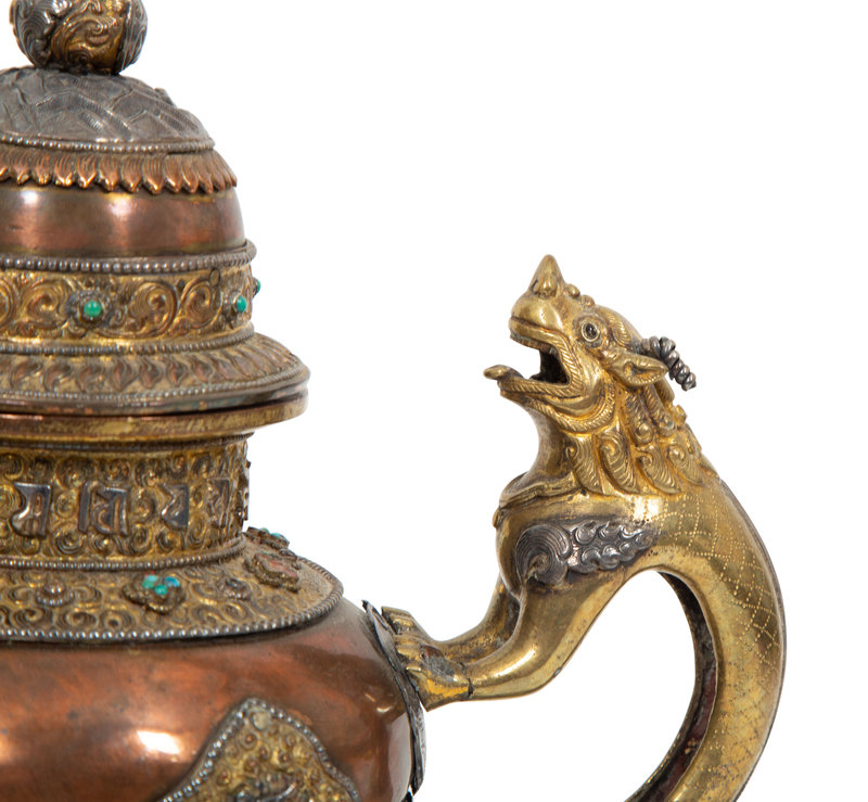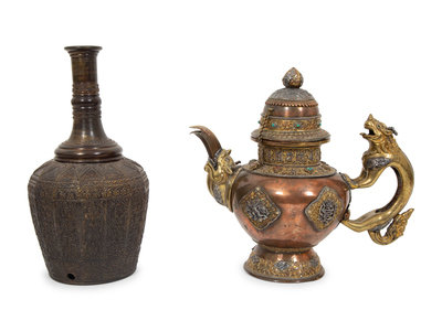 comprising a Tibetan teapot with mythical beast handle and an elephant head spout, and an Indian chased bottle-form vase.