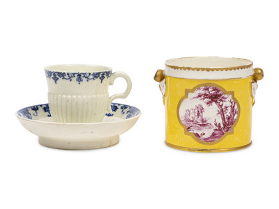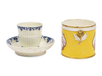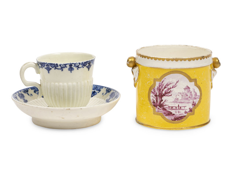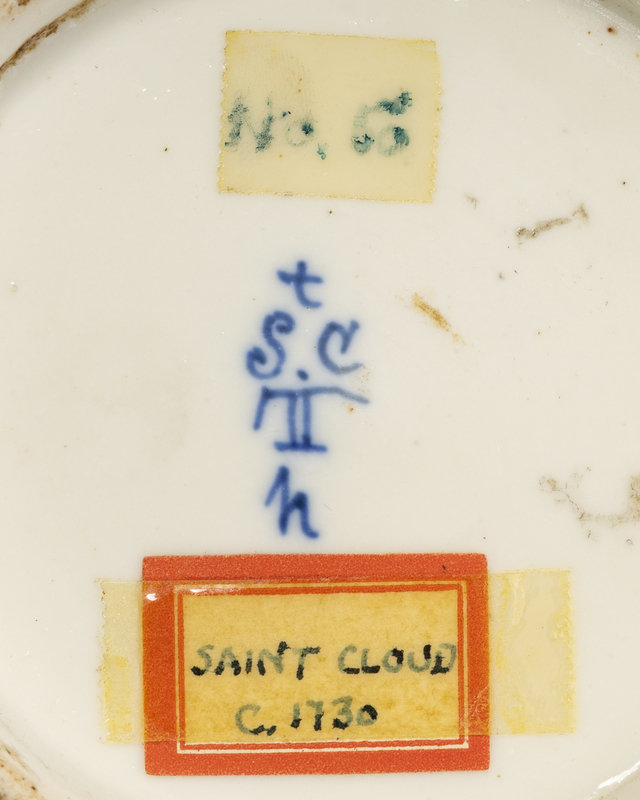 comprising a soft-paste saucer with Saint-Cloud St e C over T mark in underglaze blue to the underside, a similarly decorated soft-paste teacup, unmarked and attributed to Saint-Cloud and a cache pot marked with interlaced Cs to the underside.