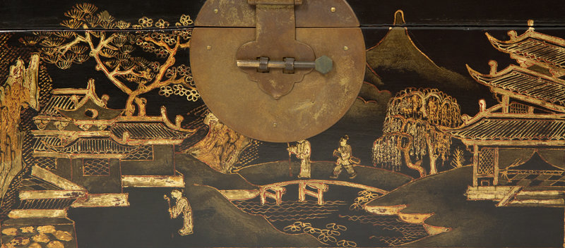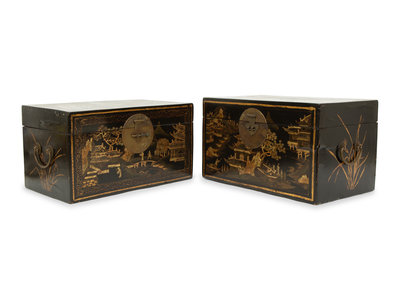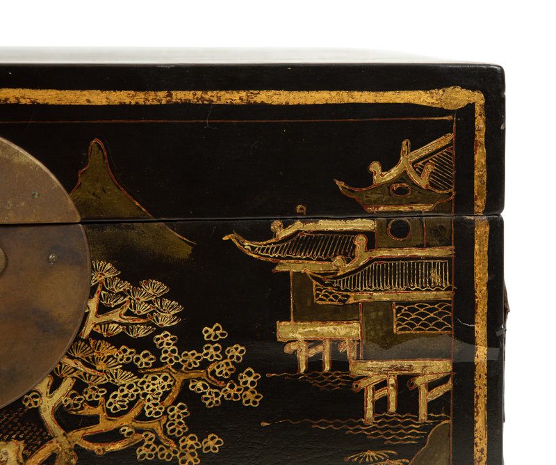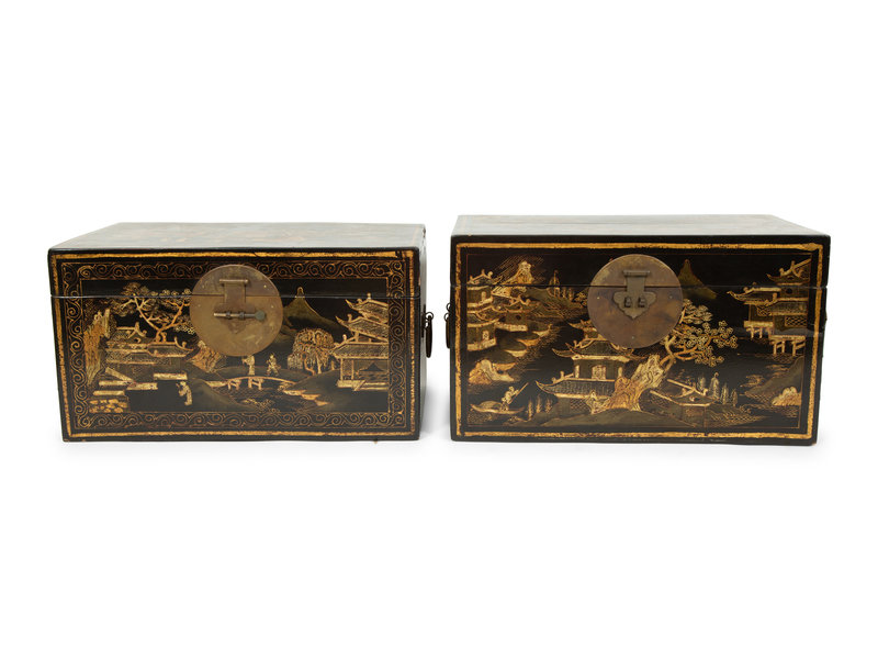 Two Chinese Black and Gilt Lacquer Boxes with Brass Mounts