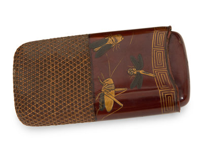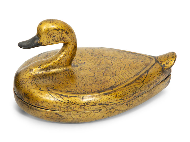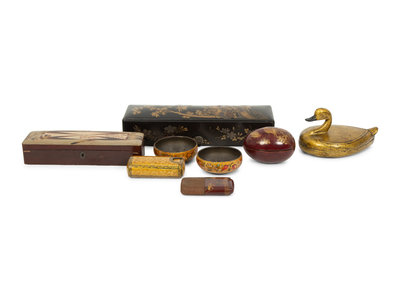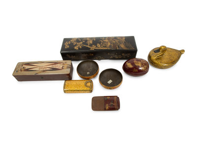 comprising two Japanese scroll boxes, an egg-form box, two cigar holders, a duck-form box and two shallow bowls.