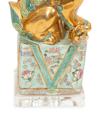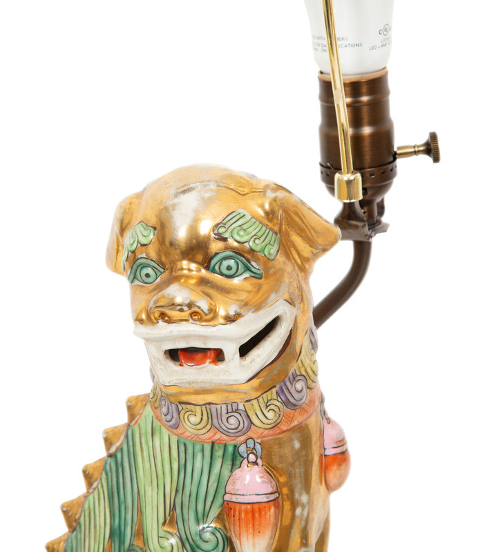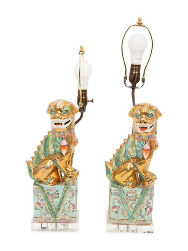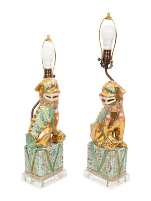 A Pair of Chinese Porcelain Foo Dog Table Lamps