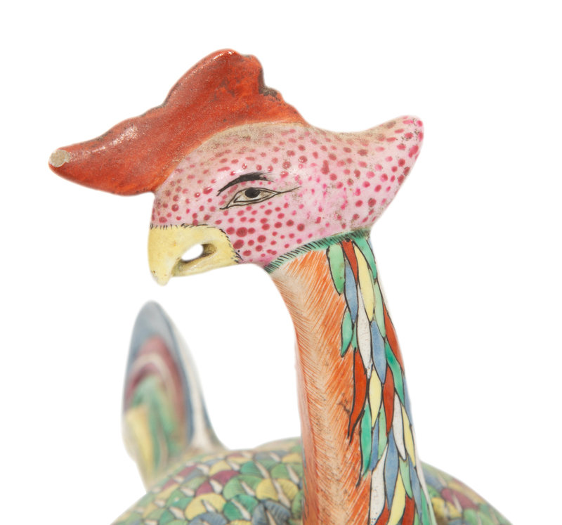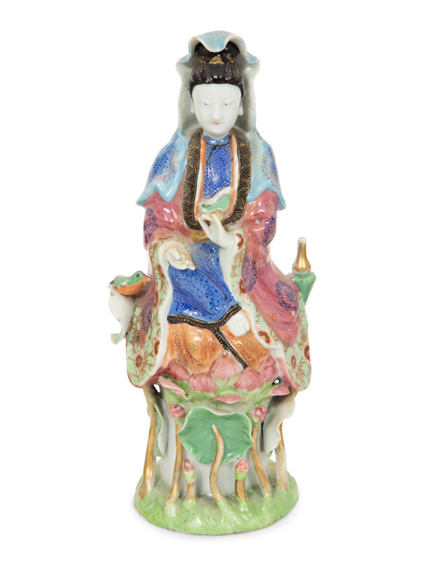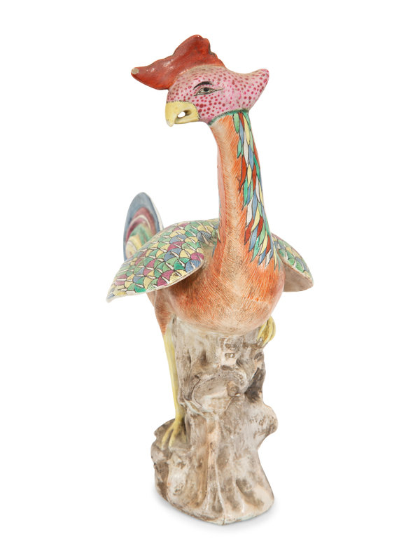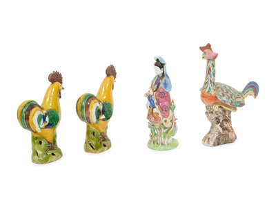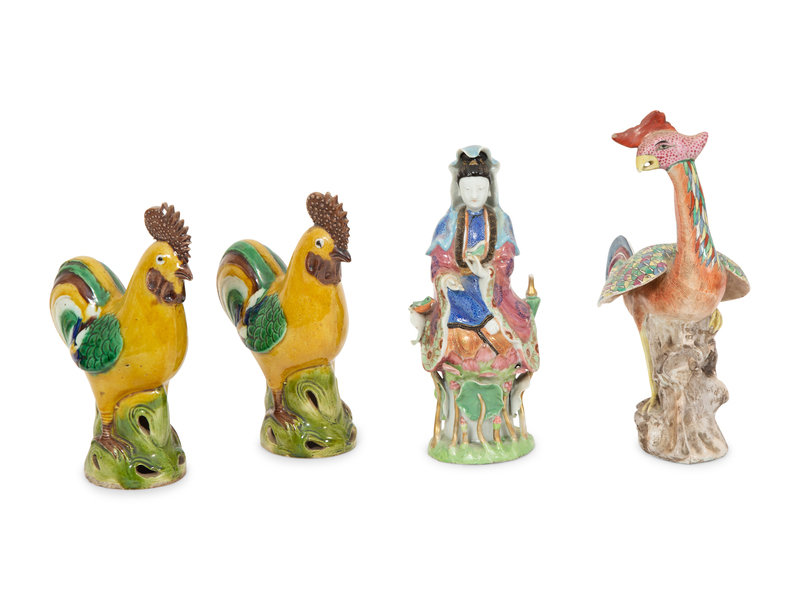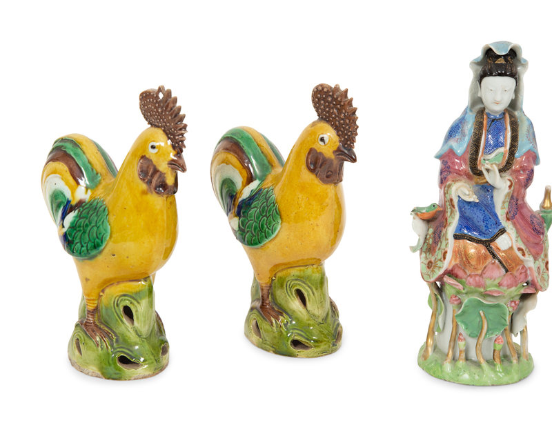 comprising a polychromed Guan Yin, a famille rose phoenix bird, and a pair of sandal glazed roosters.