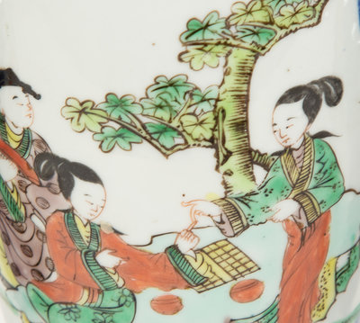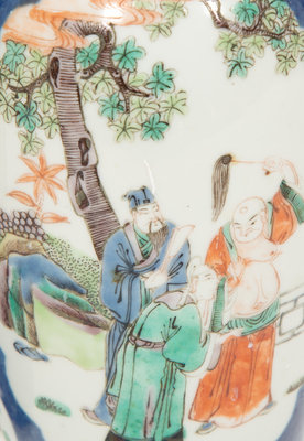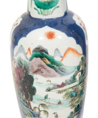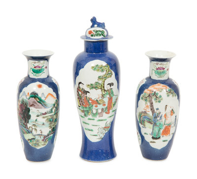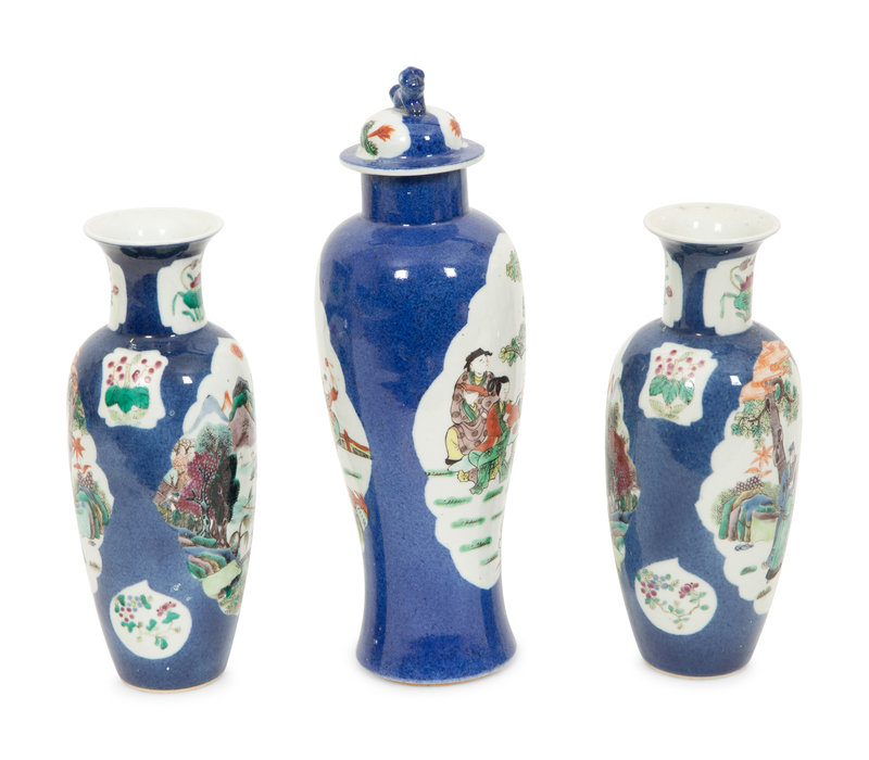with open reserves of figures and landscapes; comprising a covered jar and two rouleau-form vases.